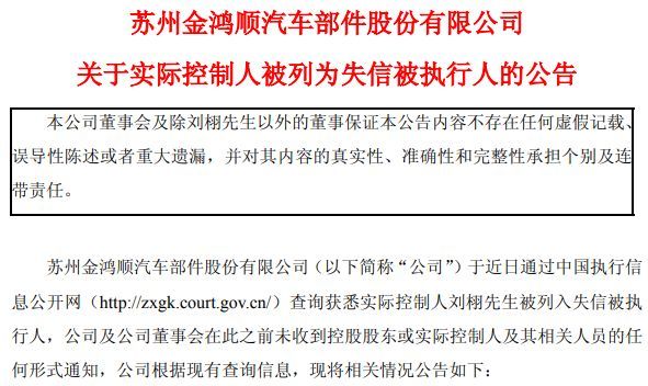 金鸿顺在公告中称,此次失信主要是因为刘栩与胡正东、泰顺县桃园置业有限公司存在合同纠纷。他因对温州汇迎科技有限公司约 9961.13万元的债务承担连带清偿责任,且全部未履行,因而被浙江省泰顺县人民法院列为失信被执行人。