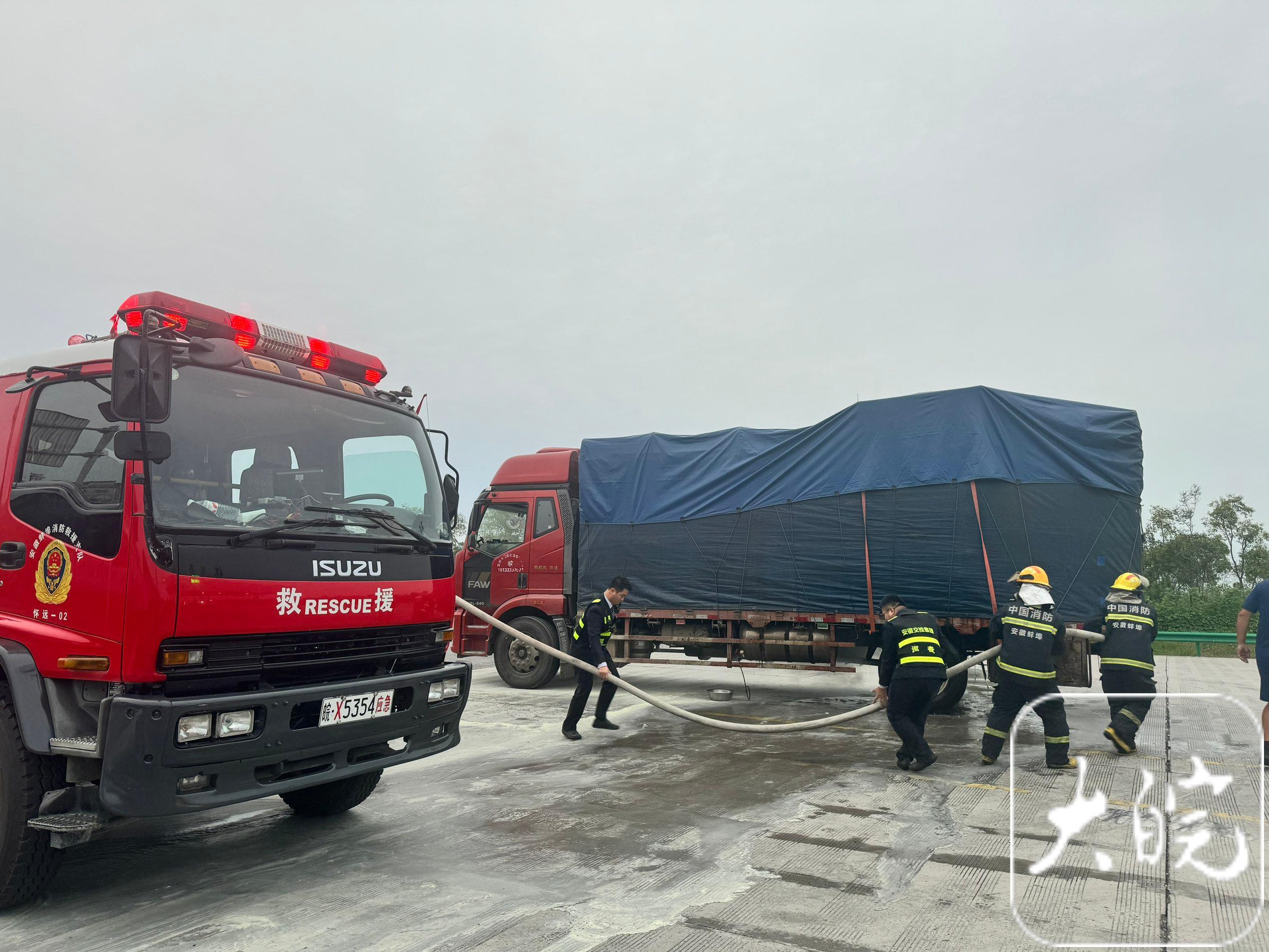 当日清晨,晨雾尚未散尽,能见度较低。一辆货车驶进怀远西收费站出口时,后轮胎开始冒出浓烟,随即火焰迅速蔓延,整个轮胎很快被火舌吞没。现场浓烟滚滚,情况万分危急。货车司机发现险情后,立即鸣笛预警,并坚持将车辆驶入收费车道寻求帮助。