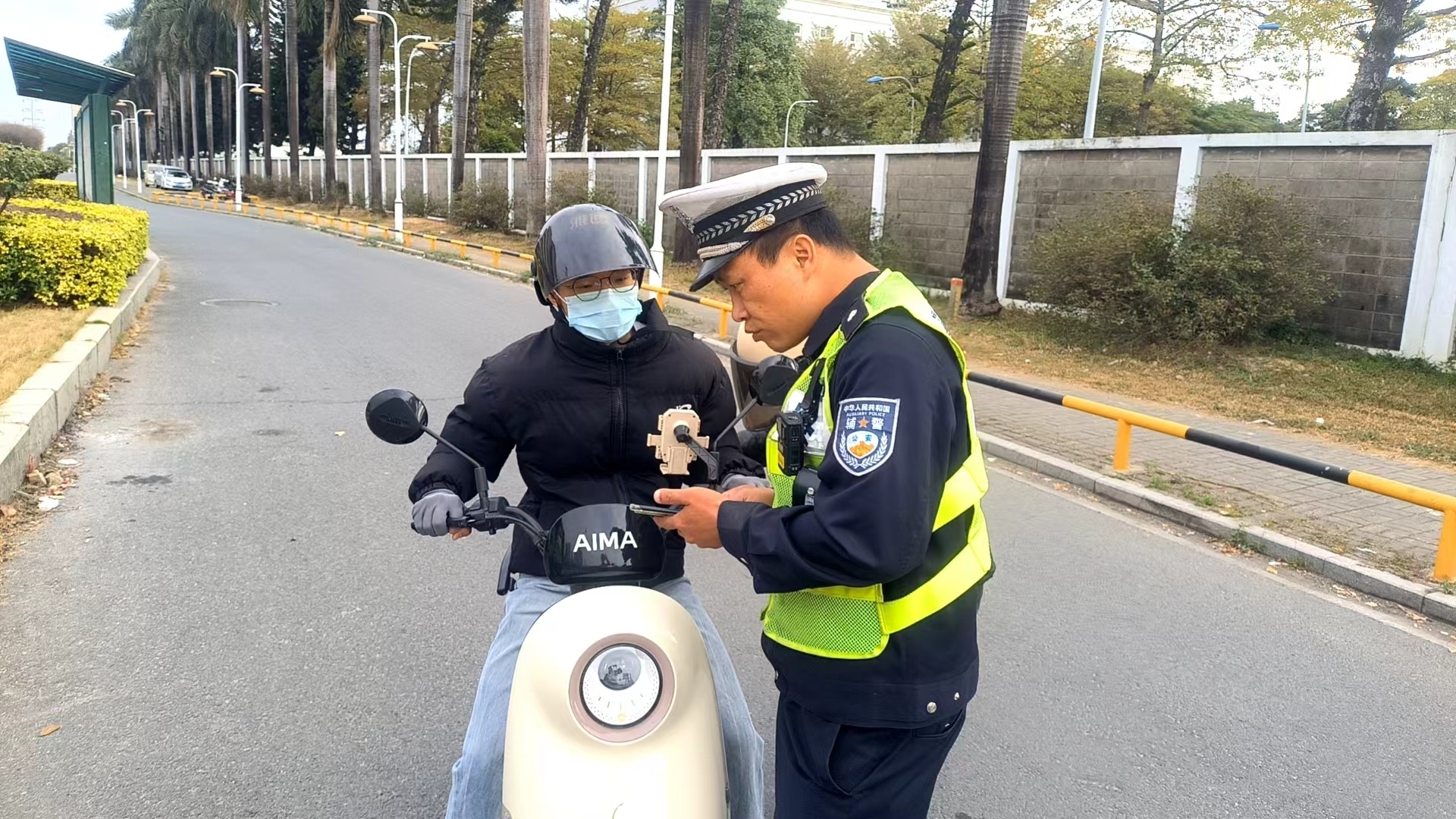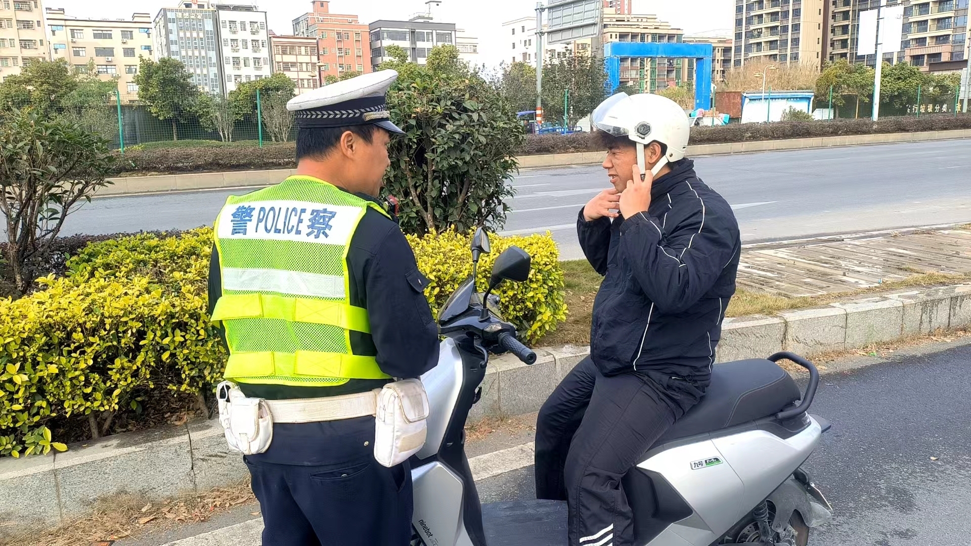 随后,民警通过派发宣传单张、面对面宣讲等方式对驾乘“电摩”不戴安全头盔的轻微违法人员进行劝导,要求他们戴好安全头盔,并现场示范如何正确佩戴安全头盔,养成安全文明出行的良好习惯,有效防范道路交通事故发生。